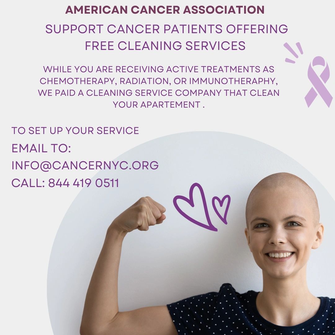 AMERICAN CANCER ASSOCIATION SUPPORTS CANCER PATIENTS OFFERING FREE CLEANING SERVICES WHILE YOU ARE RECEIVING ACTIVE TREATMENTS AS CHEMOTHERAPY, RADIATION, OR IMMUNOTHERAPHY, WE PAID A CLEANING SERVICE COMPANY THAT CLEAN YOUR APARTEMENT EMAIL TO INFO@CANCERNYC.ORG TO SET UP YOUR SERVICE.